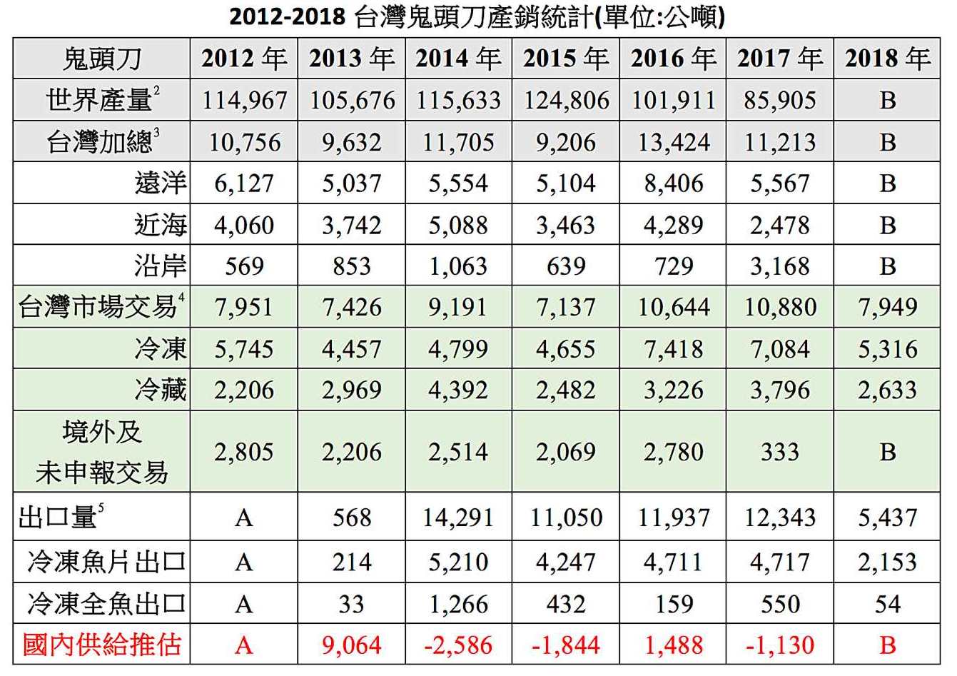 過去沿岸鬼頭刀漁獲量有許多都沒有申報漁獲,隨著美國對申報的要求,近年來申報率大幅提高。因此從統計數字來看,2017年漁獲量暴增,但是市場冷藏交易量卻未同步增加,可以看出這個增加的數量,不是「漁獲量」而是「申報量」。