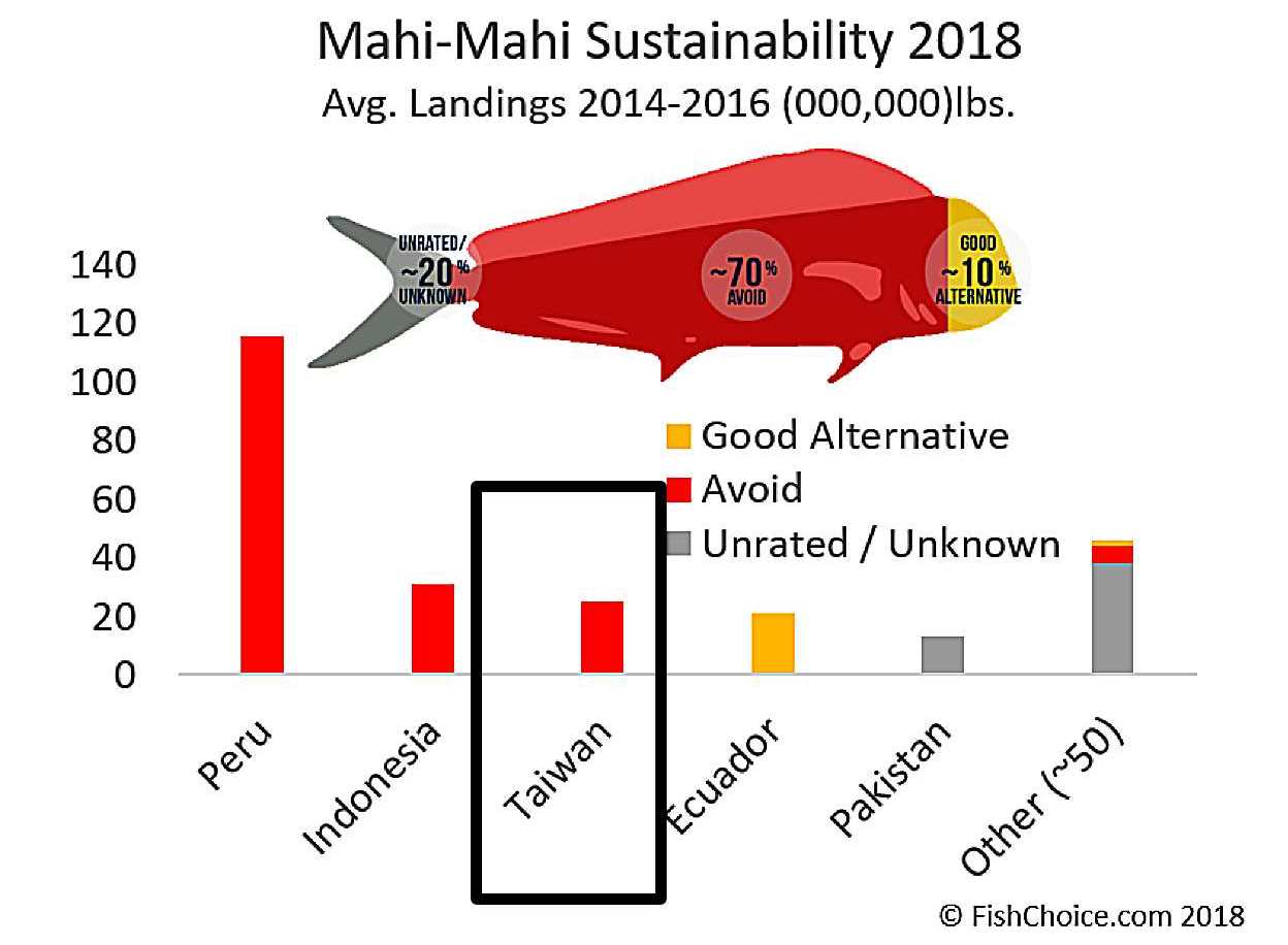 而報告中認為,來自美國當地捕撈的鬼頭刀主要來自曳繩釣﹑一支釣等小型漁業的鬼頭刀是屬於「Best Choice(最佳選擇)」,來自厄瓜多爾的近海小型圍網及小型延繩釣漁獲是屬於「Good Alternative(良好替代)」 ,來自台灣及印尼的鬼頭刀因為採用「FAD電子集魚器」(註9)的大型圍網漁法及大型鮪延繩釣,存在混獲資源敏感魚種的顧慮(concern),而且缺乏足夠及有效的管理資訊,因此屬於「Avoid(應避免食用)」的海鮮(原文摘錄請見註10)。
